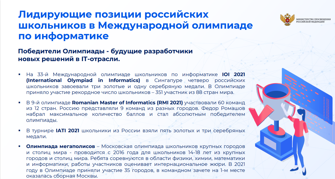 Прошли уроки на тему "Информационные технологии, вклад России. Отечественные разработки" по предмету "Информатика" для обучающихся 7-11 классов. Цель урока: формирование у обучающихся активной жизненной позиции, информирование обучающихся о высоком уровне информационных технологий в России и перспективах развития. Невозможно представить нашу жизнь без информационных технологий. Мы используем мессенджеры, общаемся в социальных сетях, смотрим и создаём видеоролики и трансляции, исследуем и учимся. Мы активно используем «умные» технологии дома, в автомобиле… Коротко говоря, используем различные цифровые сервисы.
