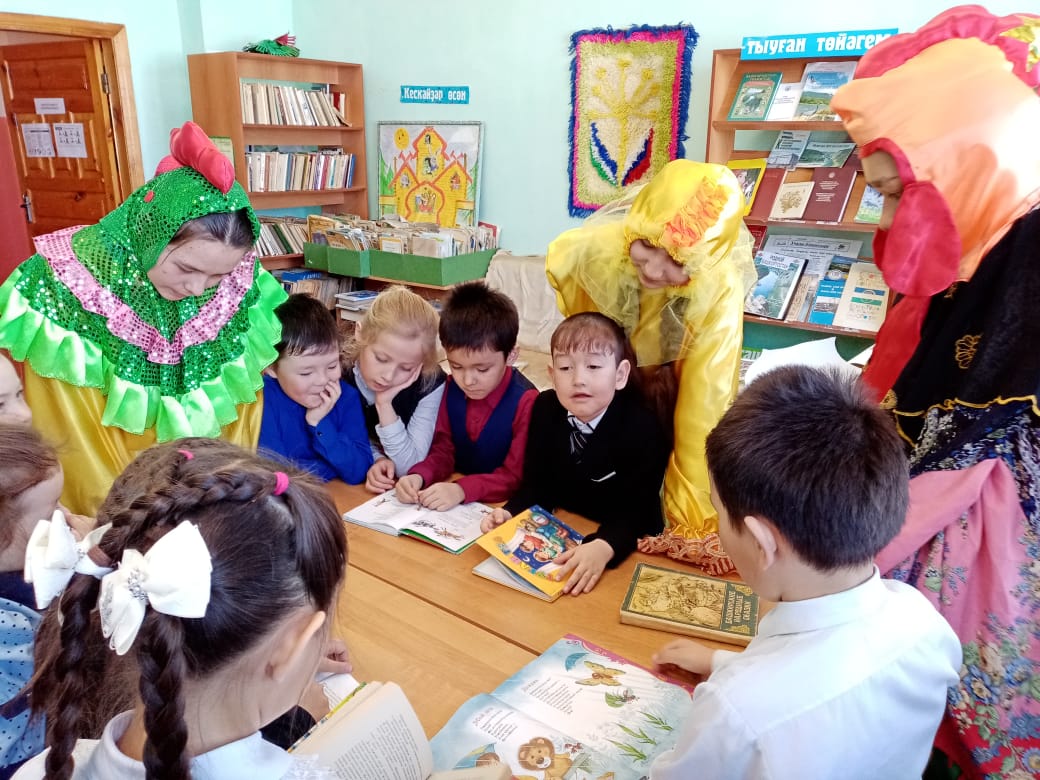 И на переменах, и на внеклассных занятиях дети с удовольствием посещают библиотеку, потому что там их ждут увлекательные книжные герои в ярких костюмах, которые шьет сама педагог- библиотекарь Хажиахметова И.Р.
